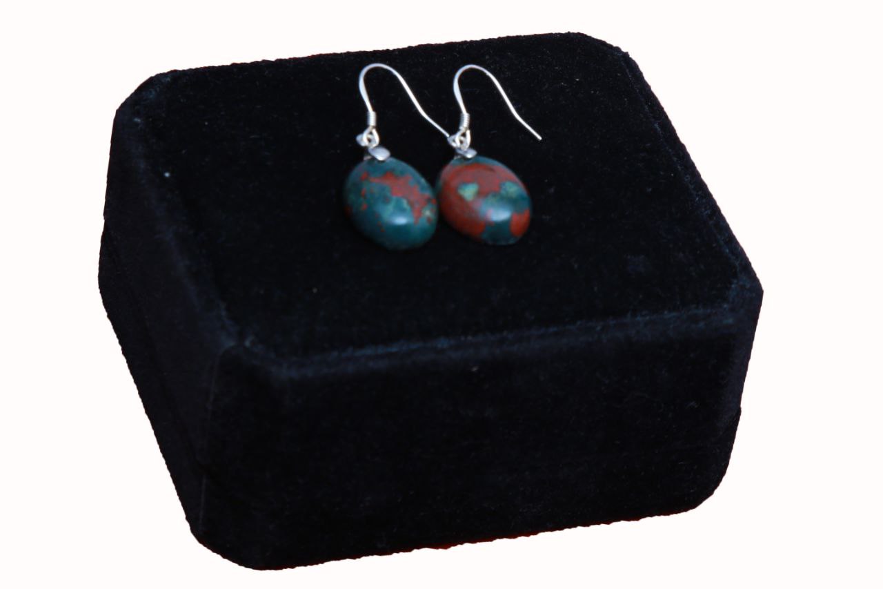 - These earrings feature striking oval-shaped bloodstone gems, each showcasing a natural mix of deep green with reddish flecks—a signature characteristic of this powerful and ancient stone. The stones are polished to a smooth finish, highlighting their earthy yet bold coloration.
