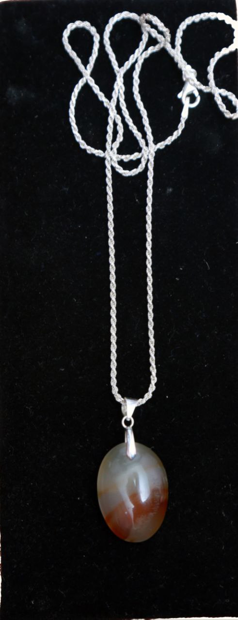 - This elegant pendant features a smoothly polished oval-shaped agate stone suspended from a delicate silver bail and chain. The silver bail is minimalist and refined, securely holding the agate while adding a cool-toned metallic contrast to the stone’s warm hues. The twisted silver chain adds a touch of texture and shine, complementing the pendant with a clean and timeless look. Overall, this pendant combines natural elegance with simple sophistication, making it a versatile accessory for both everyday wear and special occasions.